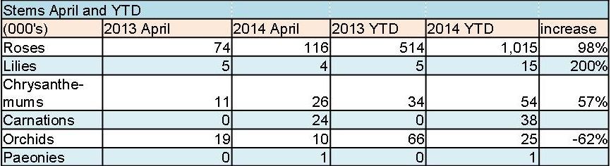 The data is of some considerable concern to New Zealand cutflower growers. Year to Date there are twice as many cut flower stems coming into the New Zealand market from offshore as was the case for the first four months of 2013.